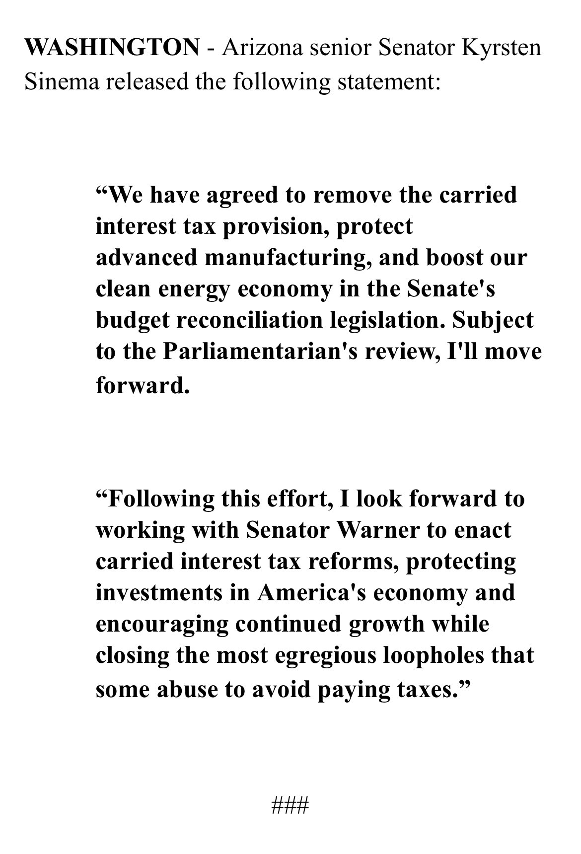 Alayna Treene On Twitter News Sinema Is Now On Board W Reconciliation Now That Key Changes Have Been Made We Have Agreed To Remove The Carried Interest Tax Provision Protect Advanced Manufacturing